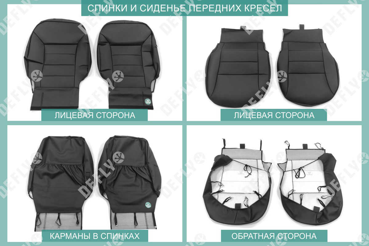 Материал: Экокожа гладкая, экокожа перфорированная, Цвет: Черный (оттенок ткани может незначительно отличаться). Модельные чехлы от производителя “Defly” индивидуально сконструированы для каждого автомобиля. Изготовленные по лекалам оригинальных кресел, чехлы гарантируют идеальную посадку. В комплектацию входят детали всех элементов салона: передних кресел, заднего дивана, третьего ряда сидений, подголовников, подлокотников и т.д. Спинки передних кресел дополнены карманами. Все швы и технологические отверстия обработаны на оверлоке. Чехлы не ограничивают заводскую функциональность салона. Наличие в чехлах специального распускаемого шва не препятствует своевременному и полному раскрытию подушек безопасности. Специально разработанная система креплений позволяет надежно зафиксировать изделия. Авточехлы изготовлены из двух видов экокожи черного цвета: гладкой и перфорированной. Перфорированная экокожа используется в центральных элементах, что обеспечивает циркуляцию воздуха. * Представленные фотографии являются примером исполнения и служат для демонстрации материалов и конструкции чехлов.