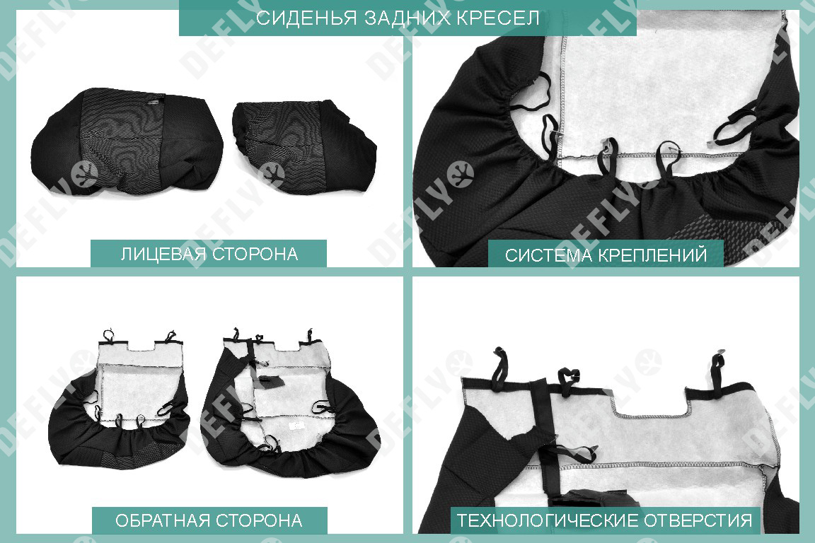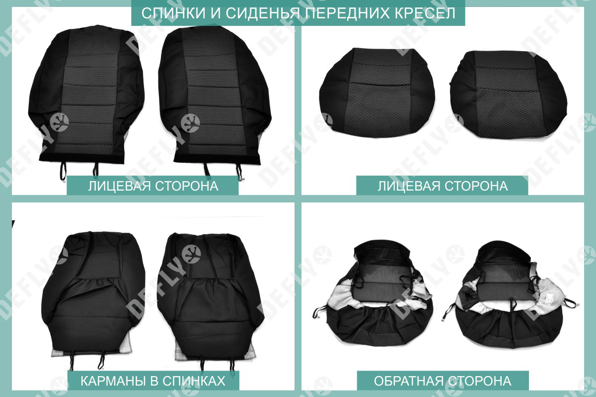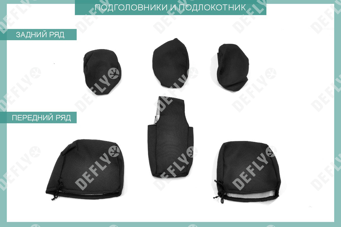 Материал: Жаккард, Цвет: Черный и темно-серый (оттенок и рисунок ткани может незначительно отличаться). Модельные чехлы от производителя “Defly” индивидуально сконструированы для каждого автомобиля. Изготовленные по лекалам оригинальных кресел, чехлы гарантируют идеальную посадку. В комплектацию входят детали всех элементов салона: передних кресел, заднего дивана, третьего ряда сидений, подголовников, подлокотников и т.д. Спинки передних кресел дополнены карманами. Все швы и технологические отверстия обработаны на оверлоке. Чехлы не ограничивают заводскую функциональность салона. Наличие в чехлах специального распускаемого шва не препятствует своевременному и полному раскрытию подушек безопасности. Специально разработанная система креплений позволяет надежно зафиксировать изделия. Авточехлы изготовлены из двух видов жаккарда: черного и темно-серого с рисунком. Подголовники, боковые и задние элементы выполнены из черного жаккарда. Центральные вставки сидений изготовлены из темно-серого жаккарда. Жаккард обеспечивает циркуляцию воздуха, что обеспечивает комфорт при длительных поездках. * Представленные фотографии являются примером исполнения и служат для демонстрации материалов и конструкции чехлов