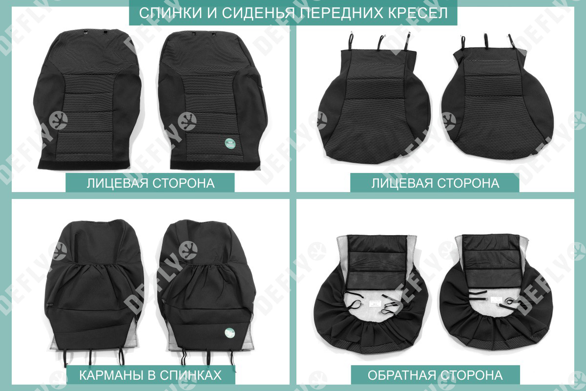Материал: Жаккард, Цвет: Черный и темно-серый (оттенок и рисунок ткани может незначительно отличаться). Модельные чехлы от производителя “Defly” индивидуально сконструированы для каждого автомобиля. Изготовленные по лекалам оригинальных кресел, чехлы гарантируют идеальную посадку. В комплектацию входят детали всех элементов салона: передних кресел, заднего дивана, третьего ряда сидений, подголовников, подлокотников и т.д. Спинки передних кресел дополнены карманами. Все швы и технологические отверстия обработаны на оверлоке. Чехлы не ограничивают заводскую функциональность салона. Наличие в чехлах специального распускаемого шва не препятствует своевременному и полному раскрытию подушек безопасности. Специально разработанная система креплений позволяет надежно зафиксировать изделия. Авточехлы изготовлены из двух видов жаккарда: черного и темно-серого с рисунком. Подголовники, боковые и задние элементы выполнены из черного жаккарда. Центральные вставки сидений изготовлены из темно-серого жаккарда. Жаккард обеспечивает циркуляцию воздуха, что обеспечивает комфорт при длительных поездках. * Представленные фотографии являются примером исполнения и служат для демонстрации материалов и конструкции чехлов