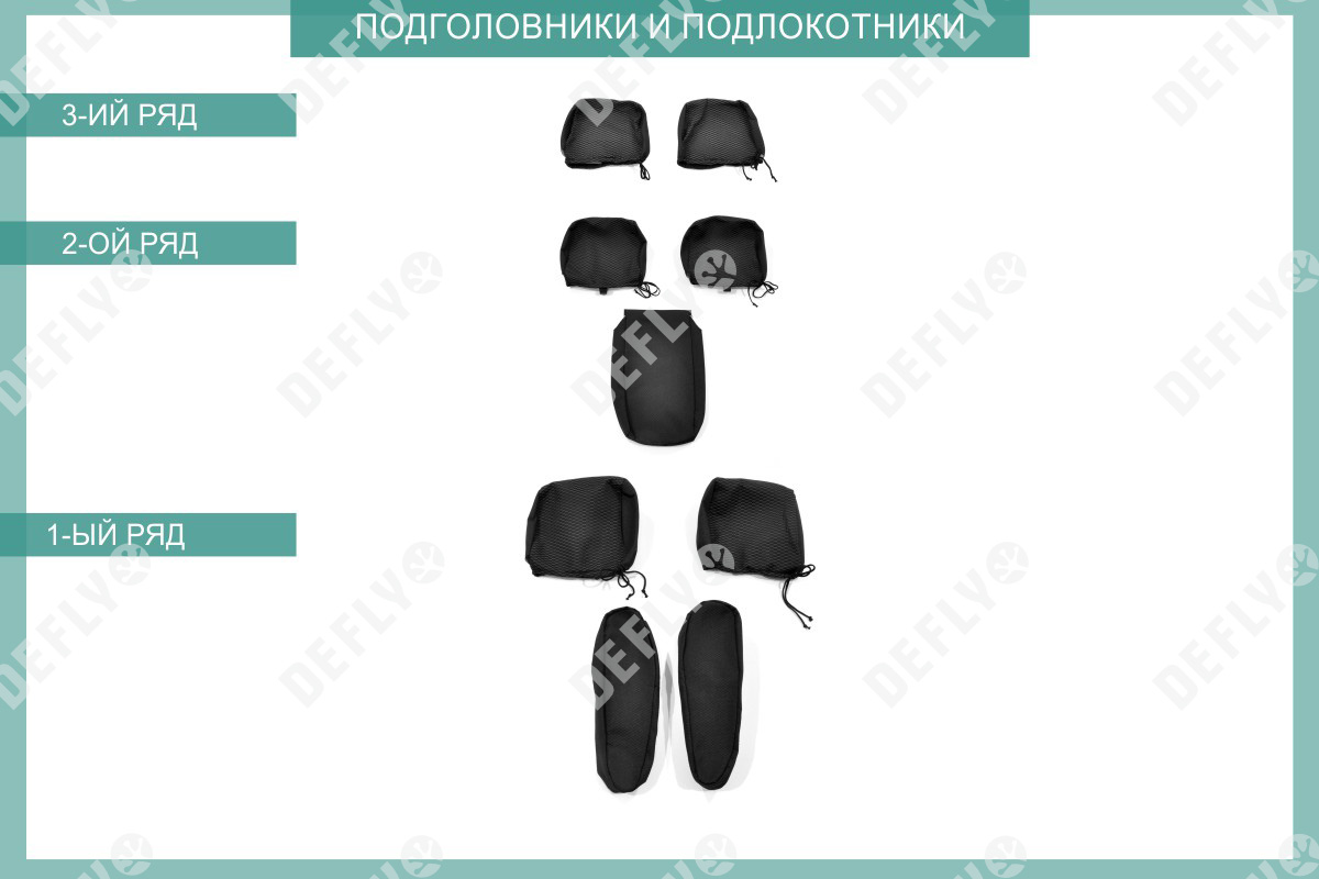Первый ряд: Подголовник переднего кресла – 2 шт Спинка переднего кресла – 2 шт Сиденье переднего кресла – 2 шт Подлокотник переднего кресла – 2 шт Второй ряд: Подголовник среднего ряда – 2 шт Спинка дивана среднего рада большая – 1 шт Спинка дивана среднего ряда малая – 1 шт Сиденье дивана среднего ряда малое – 1 шт Сиденье дивана среднего ряда большое – 1 шт Подлокотник среднего ряда – 1 шт Третий ряд: Подголовник заднего ряда – 2 шт Спинка дивана заднего ряда – 2 шт Сиденье дивана заднего ряда – 2 шт Итого: 21 изделие
