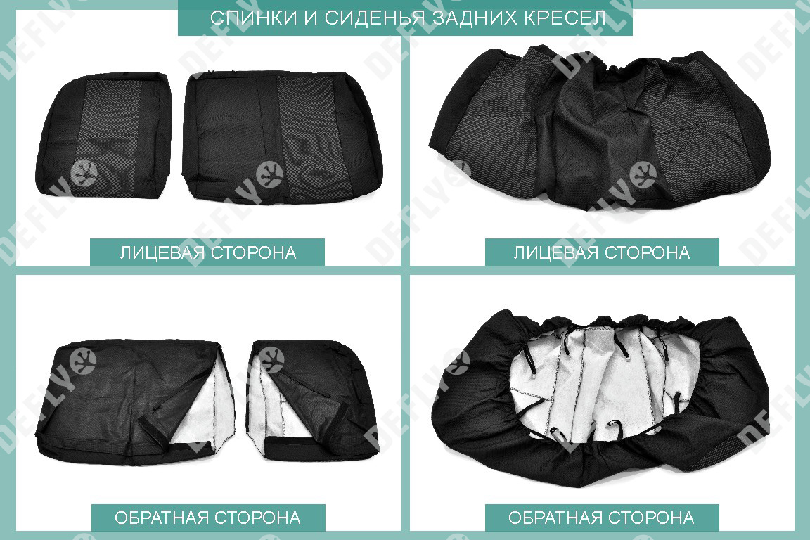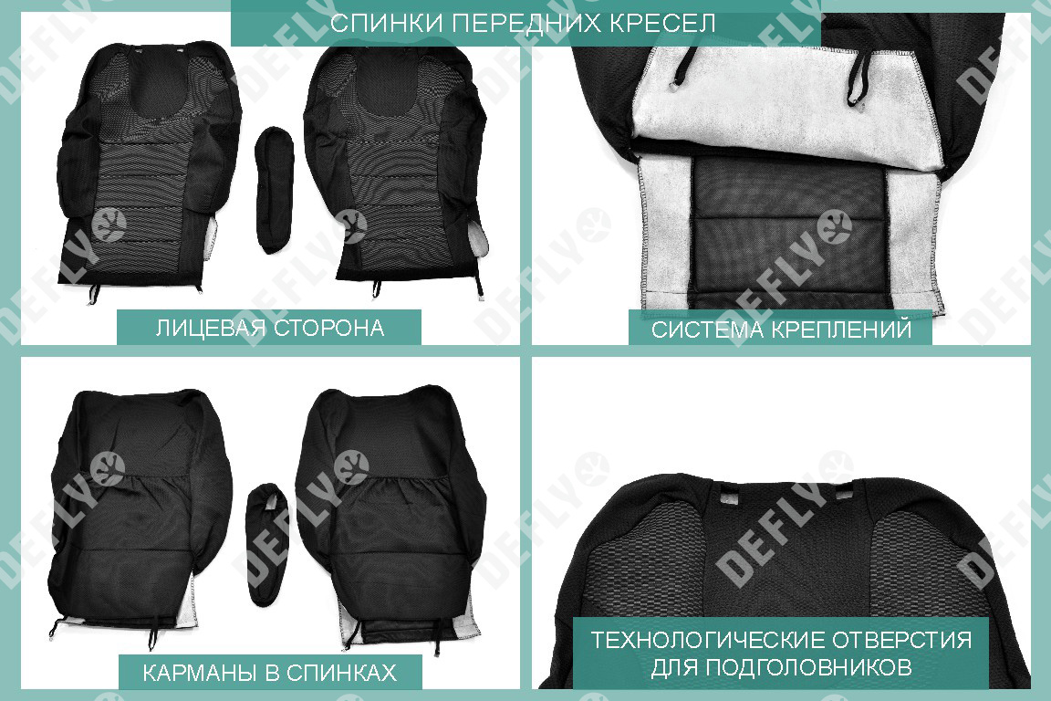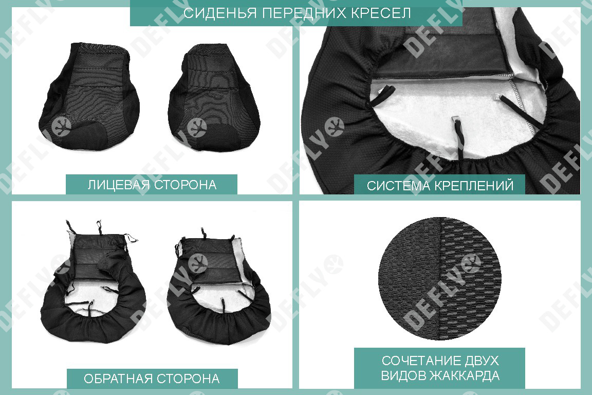 Материал: Жаккард, Цвет: Черный и темно-серый (оттенок и рисунок ткани может незначительно отличаться). Модельные чехлы от производителя “Defly” индивидуально сконструированы для каждого автомобиля. Изготовленные по лекалам оригинальных кресел, чехлы гарантируют идеальную посадку. В комплектацию входят детали всех элементов салона: передних кресел, заднего дивана, третьего ряда сидений, подголовников, подлокотников и т.д. Спинки передних кресел дополнены карманами. Все швы и технологические отверстия обработаны на оверлоке. Чехлы не ограничивают заводскую функциональность салона. Наличие в чехлах специального распускаемого шва не препятствует своевременному и полному раскрытию подушек безопасности. Специально разработанная система креплений позволяет надежно зафиксировать изделия. Авточехлы изготовлены из двух видов жаккарда: черного и темно-серого с рисунком. Подголовники, боковые и задние элементы выполнены из черного жаккарда. Центральные вставки сидений изготовлены из темно-серого жаккарда. Жаккард обеспечивает циркуляцию воздуха, что обеспечивает комфорт при длительных поездках. * Представленные фотографии являются примером исполнения и служат для демонстрации материалов и конструкции чехлов