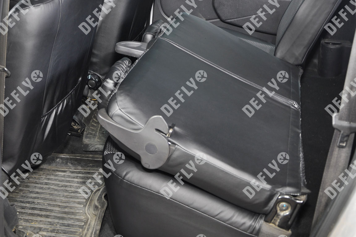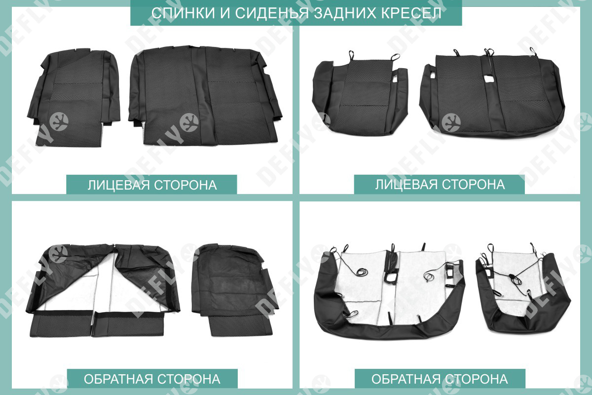 Материал: Экокожа гладкая, жаккард, Цвет: Черный и темно-серый (оттенок ткани может незначительно отличаться). Модельные чехлы от производителя “Defly” индивидуально сконструированы для каждого автомобиля. Изготовленные по лекалам оригинальных кресел, чехлы гарантируют идеальную посадку. В комплектацию входят детали всех элементов салона: передних кресел, заднего дивана, третьего ряда сидений, подголовников, подлокотников и т.д. Спинки передних кресел дополнены карманами. Все швы и технологические отверстия обработаны на оверлоке. Чехлы не ограничивают заводскую функциональность салона. Наличие в чехлах специального распускаемого шва не препятствует своевременному и полному раскрытию подушек безопасности. Специально разработанная система креплений позволяет надежно зафиксировать изделия. В комбинированных чехлах этой серии подголовники, боковые и задние элементы выполнены из черной экокожи, а центральные вставки сидений изготовлены из темно-серого жаккарда. Жаккардовые вставки обеспечивают циркуляцию воздуха, что обеспечивает комфорт при длительных поездках. * Представленные фотографии являются примером исполнения и служат для демонстрации материалов и конструкции чехлов.