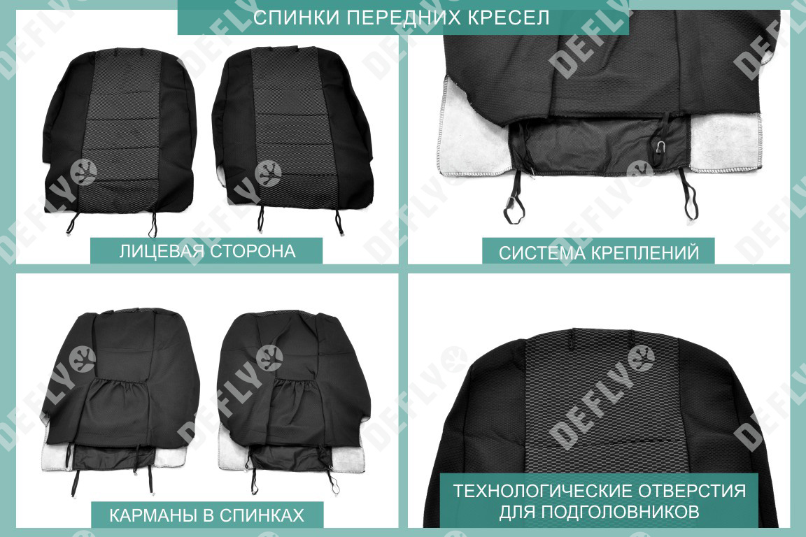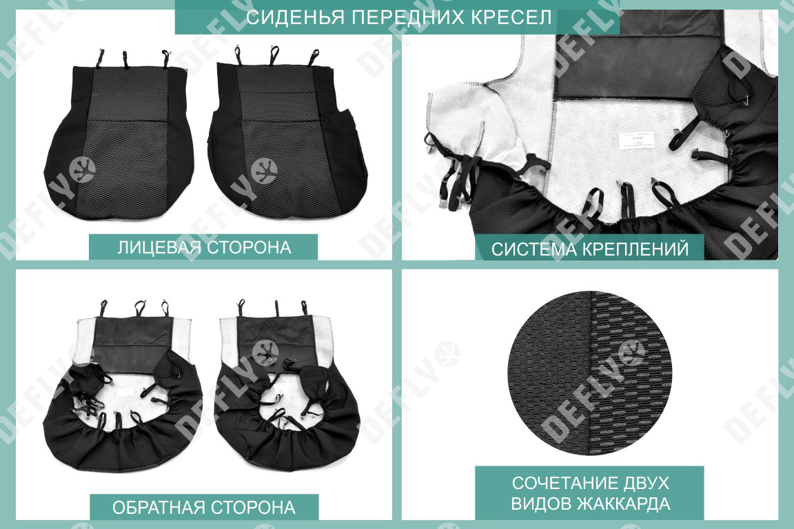 Материал: Жаккард, Цвет: Черный и темно-серый (оттенок и рисунок ткани может незначительно отличаться). Модельные чехлы от производителя “Defly” индивидуально сконструированы для каждого автомобиля. Изготовленные по лекалам оригинальных кресел, чехлы гарантируют идеальную посадку. В комплектацию входят детали всех элементов салона: передних кресел, заднего дивана, третьего ряда сидений, подголовников, подлокотников и т.д. Спинки передних кресел дополнены карманами. Все швы и технологические отверстия обработаны на оверлоке. Чехлы не ограничивают заводскую функциональность салона. Наличие в чехлах специального распускаемого шва не препятствует своевременному и полному раскрытию подушек безопасности. Специально разработанная система креплений позволяет надежно зафиксировать изделия. Авточехлы изготовлены из двух видов жаккарда: черного и темно-серого с рисунком. Подголовники, боковые и задние элементы выполнены из черного жаккарда. Центральные вставки сидений изготовлены из темно-серого жаккарда. Жаккард обеспечивает циркуляцию воздуха, что обеспечивает комфорт при длительных поездках. * Представленные фотографии являются примером исполнения и служат для демонстрации материалов и конструкции чехлов