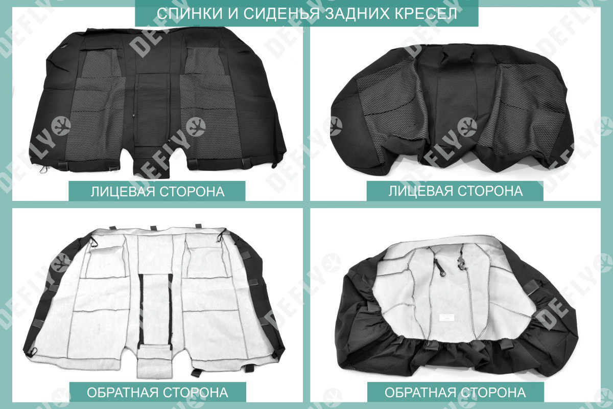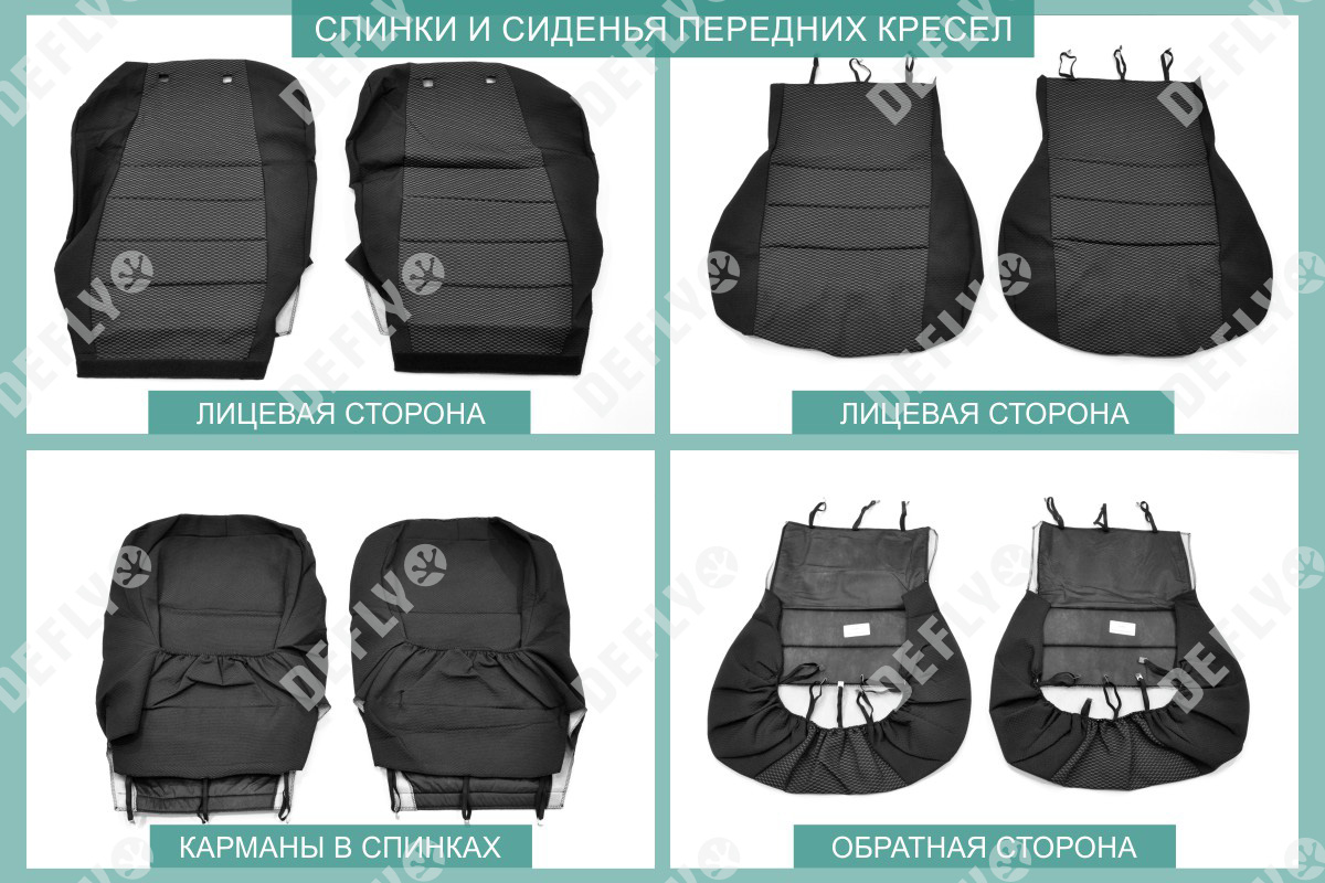 Материал: Жаккард, Цвет: Черный и темно-серый (оттенок и рисунок ткани может незначительно отличаться). Модельные чехлы от производителя “Defly” индивидуально сконструированы для каждого автомобиля. Изготовленные по лекалам оригинальных кресел, чехлы гарантируют идеальную посадку. В комплектацию входят детали всех элементов салона: передних кресел, заднего дивана, третьего ряда сидений, подголовников, подлокотников и т.д. Спинки передних кресел дополнены карманами. Все швы и технологические отверстия обработаны на оверлоке. Чехлы не ограничивают заводскую функциональность салона. Наличие в чехлах специального распускаемого шва не препятствует своевременному и полному раскрытию подушек безопасности. Специально разработанная система креплений позволяет надежно зафиксировать изделия. Авточехлы изготовлены из двух видов жаккарда: черного и темно-серого с рисунком. Подголовники, боковые и задние элементы выполнены из черного жаккарда. Центральные вставки сидений изготовлены из темно-серого жаккарда. Жаккард обеспечивает циркуляцию воздуха, что обеспечивает комфорт при длительных поездках. * Представленные фотографии являются примером исполнения и служат для демонстрации материалов и конструкции чехлов