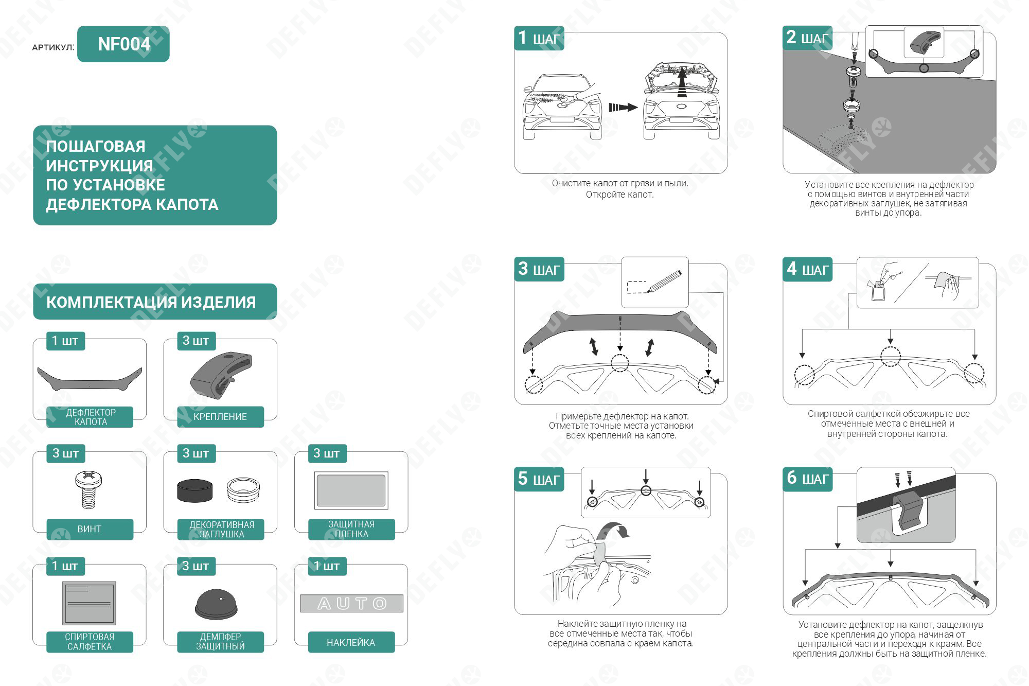 Дефлекторы капота от производителя “Defly” серии NEOFIX имеют уникальную систему креплений, разработанную и запатентованную компанией "Defly", которая обеспечивает надежную и легкую фиксацию изделия, не повреждая покрытие автомобиля. Агрессивная аэродинамическая форма дефлекторов эффективно перенаправляет воздушные потоки, защищая лакокрасочное покрытие капота и лобовое стекло. Изделие минимально влияет на аэродинамические характеристики автомобиля и органично вписывается в его дизайн. Дополнительные демпферы предотвращают вибрации дефлектора при движении. Изделие легко снимается, что позволяет беспрепятственно мыть, красить и производить необходимые действия с транспортным средством.