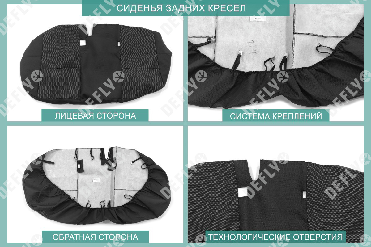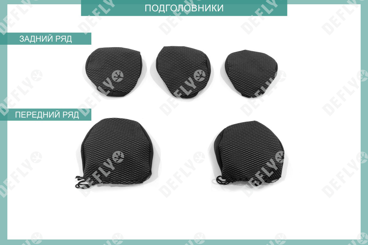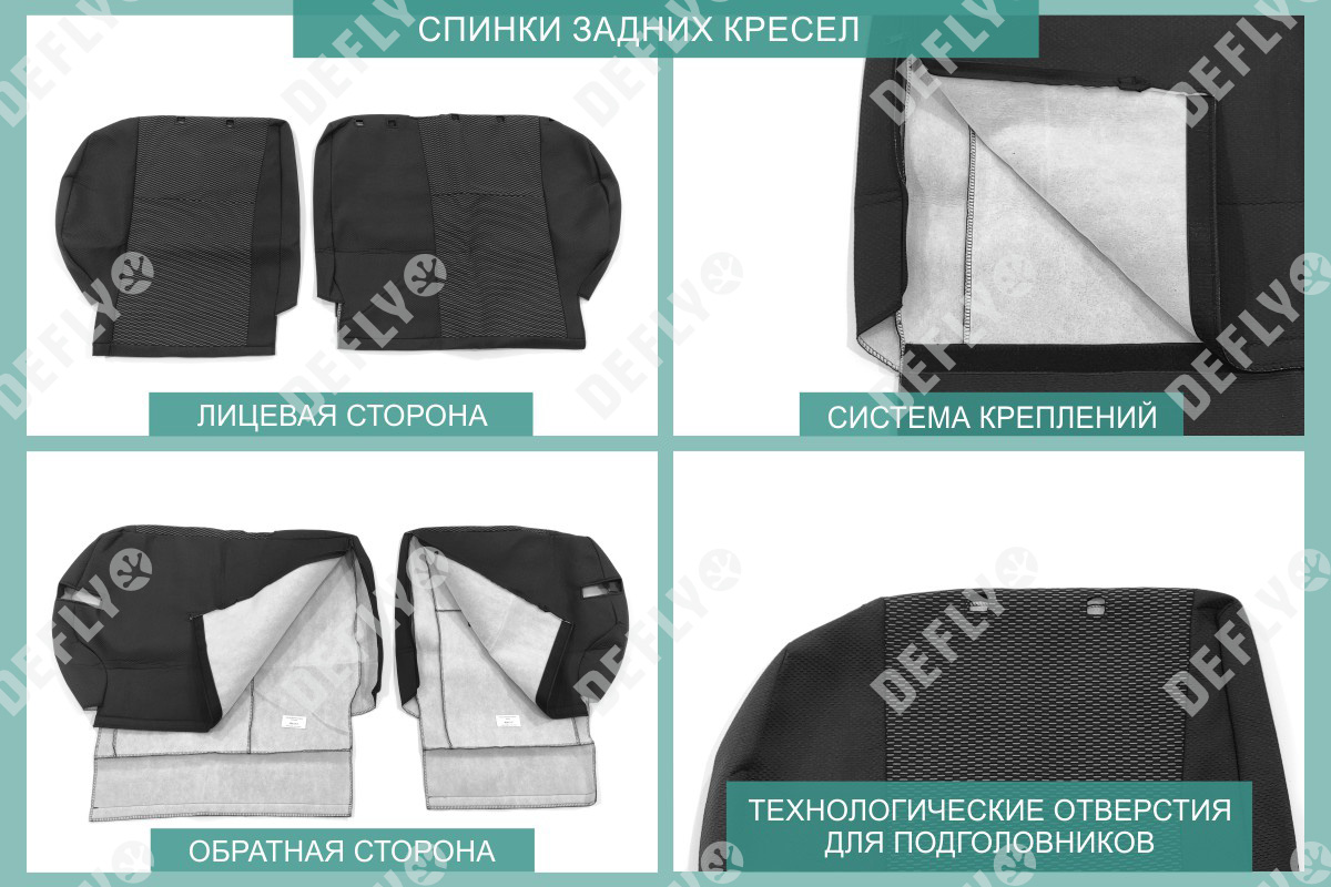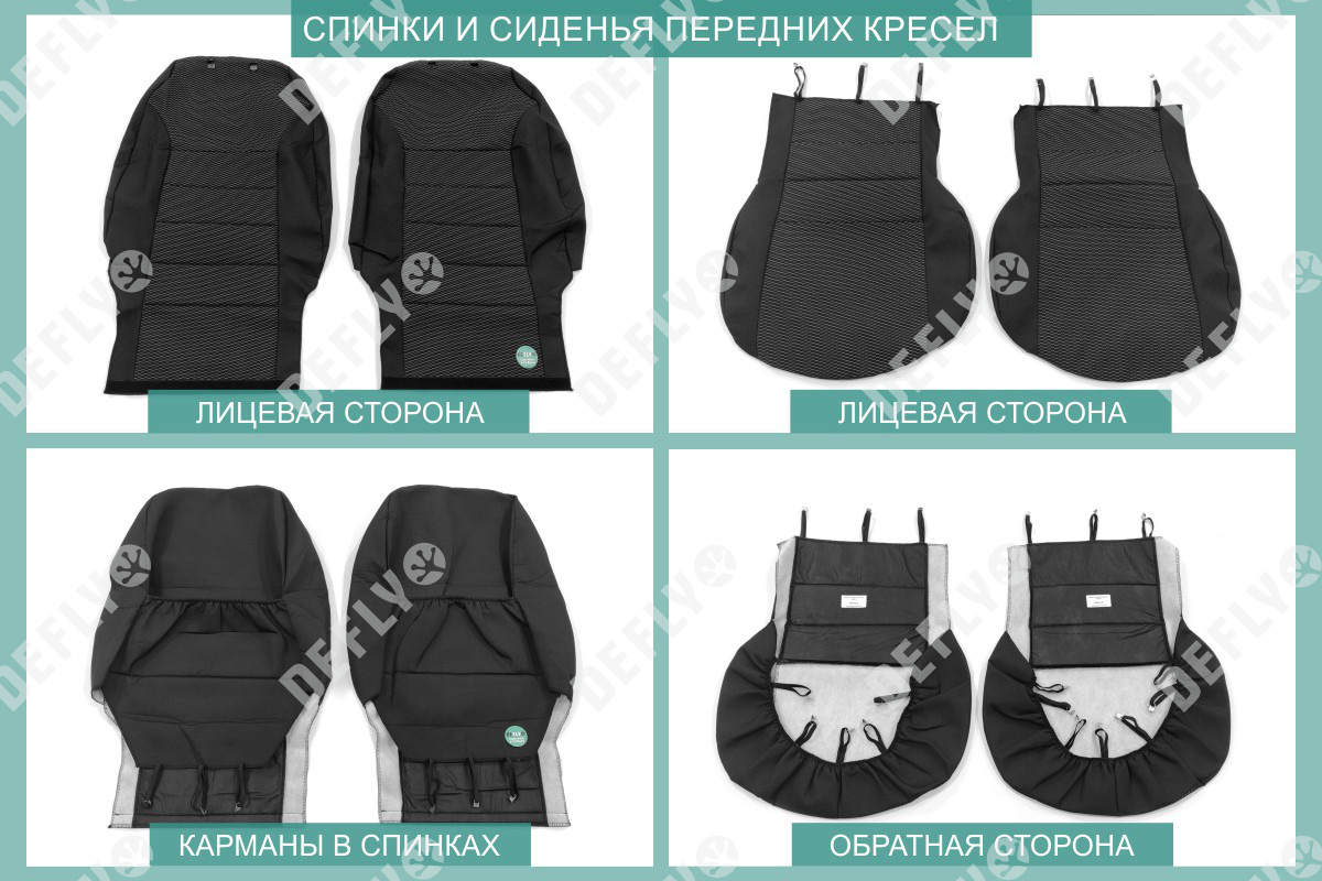 Материал: Жаккард, Цвет: Черный и темно-серый (оттенок и рисунок ткани может незначительно отличаться). Модельные чехлы от производителя “Defly” индивидуально сконструированы для каждого автомобиля. Изготовленные по лекалам оригинальных кресел, чехлы гарантируют идеальную посадку. В комплектацию входят детали всех элементов салона: передних кресел, заднего дивана, третьего ряда сидений, подголовников, подлокотников и т.д. Спинки передних кресел дополнены карманами. Все швы и технологические отверстия обработаны на оверлоке. Чехлы не ограничивают заводскую функциональность салона. Наличие в чехлах специального распускаемого шва не препятствует своевременному и полному раскрытию подушек безопасности. Специально разработанная система креплений позволяет надежно зафиксировать изделия. Авточехлы изготовлены из двух видов жаккарда: черного и темно-серого с рисунком. Подголовники, боковые и задние элементы выполнены из черного жаккарда. Центральные вставки сидений изготовлены из темно-серого жаккарда. Жаккард обеспечивает циркуляцию воздуха, что обеспечивает комфорт при длительных поездках. * Представленные фотографии являются примером исполнения и служат для демонстрации материалов и конструкции чехлов