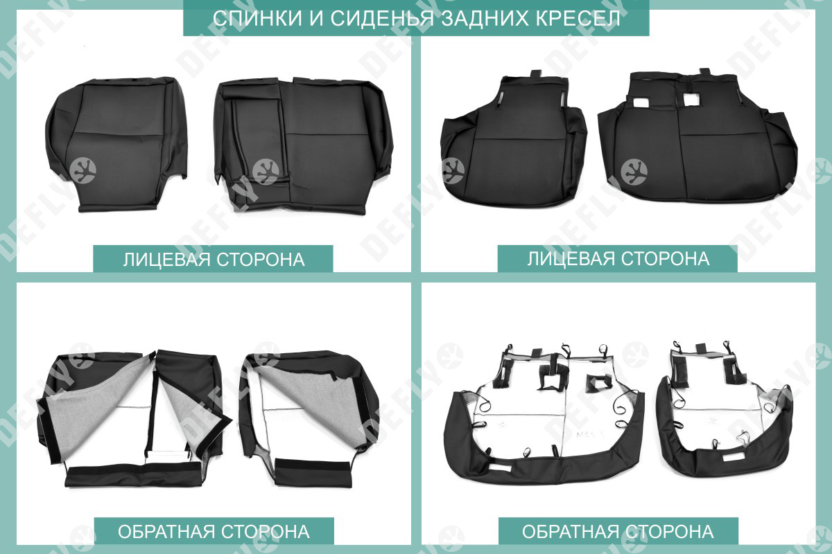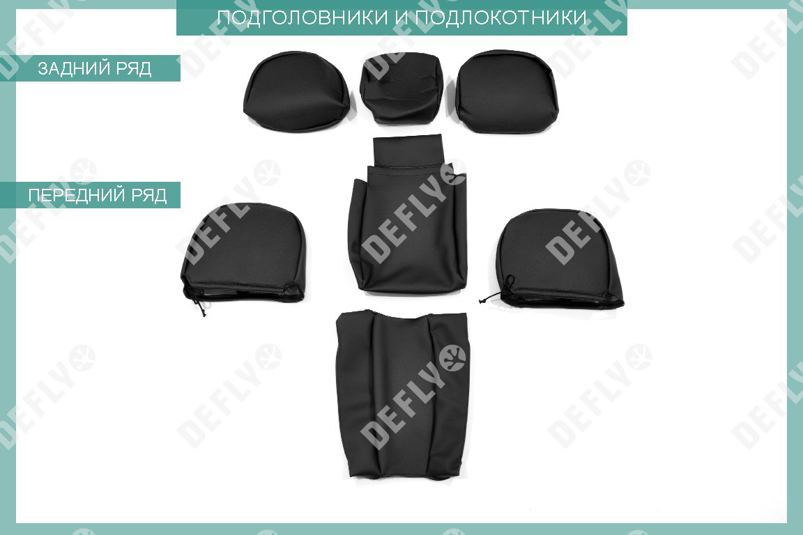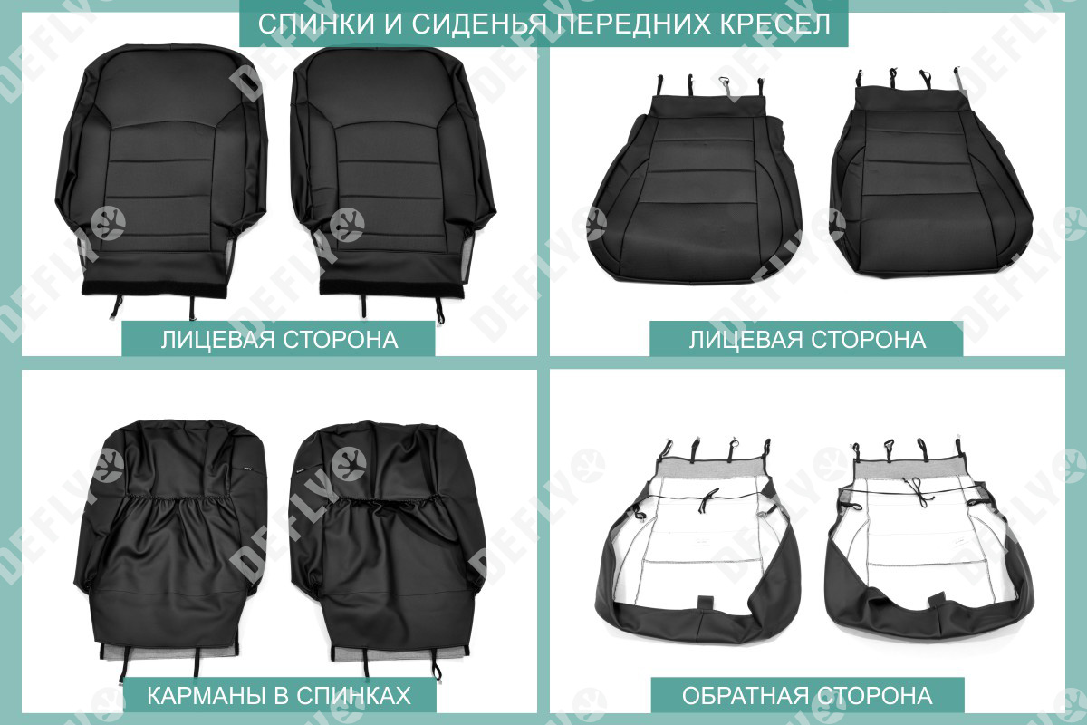Материал: Экокожа гладкая, экокожа перфорированная, Цвет: Черный (оттенок ткани может незначительно отличаться). Модельные чехлы от производителя “Defly” индивидуально сконструированы для каждого автомобиля. Изготовленные по лекалам оригинальных кресел, чехлы гарантируют идеальную посадку. В комплектацию входят детали всех элементов салона: передних кресел, заднего дивана, третьего ряда сидений, подголовников, подлокотников и т.д. Спинки передних кресел дополнены карманами. Все швы и технологические отверстия обработаны на оверлоке. Чехлы не ограничивают заводскую функциональность салона. Наличие в чехлах специального распускаемого шва не препятствует своевременному и полному раскрытию подушек безопасности. Специально разработанная система креплений позволяет надежно зафиксировать изделия. Авточехлы изготовлены из двух видов экокожи черного цвета: гладкой и перфорированной. Перфорированная экокожа используется в центральных элементах, что обеспечивает циркуляцию воздуха. * Представленные фотографии являются примером исполнения и служат для демонстрации материалов и конструкции чехлов.