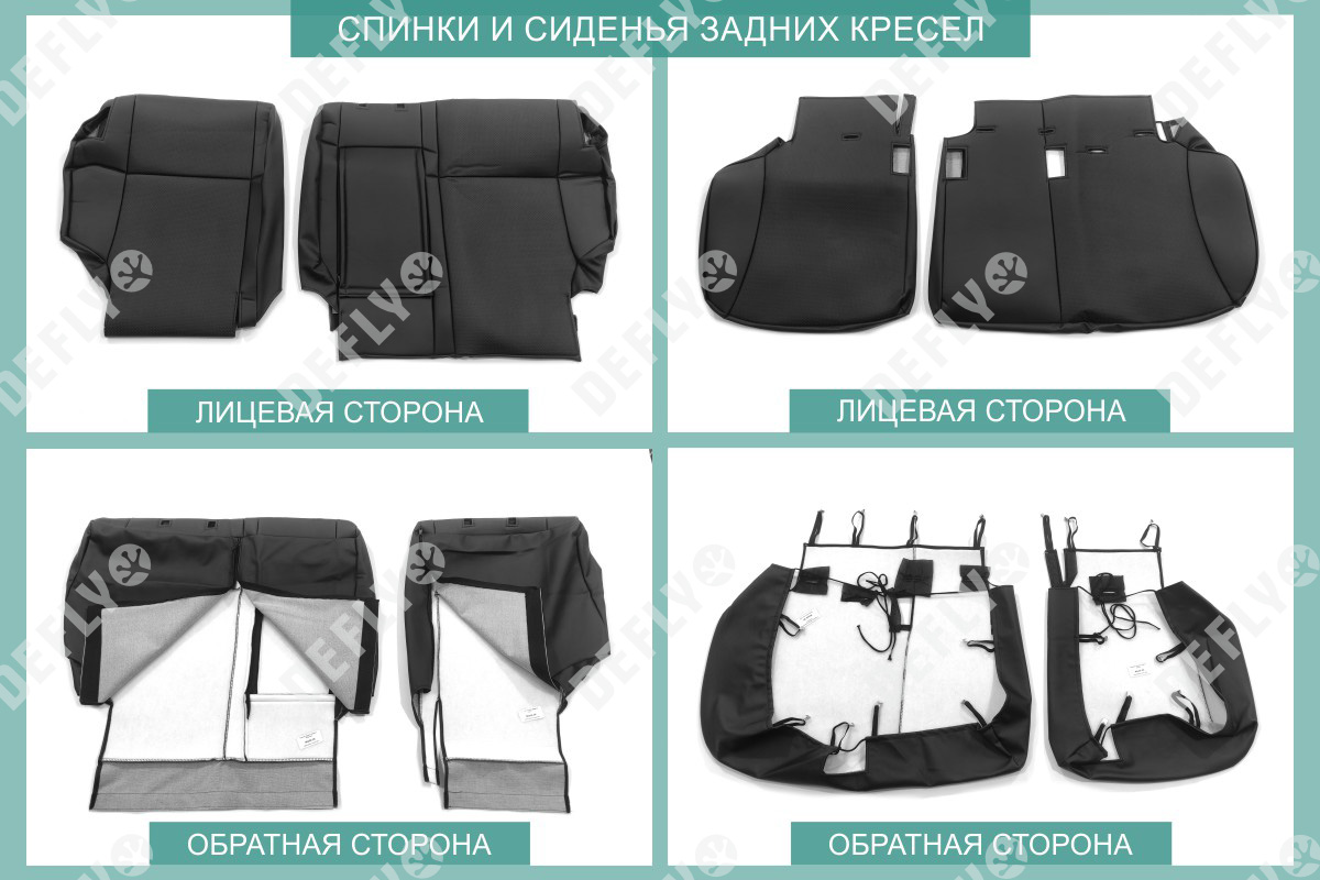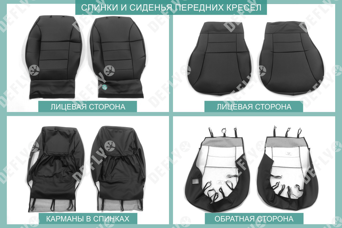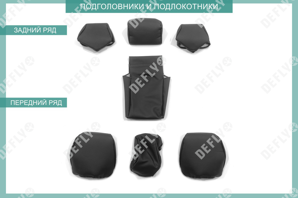 Материал: Экокожа гладкая, экокожа перфорированная, Цвет: Черный (оттенок ткани может незначительно отличаться). Модельные чехлы от производителя “Defly” индивидуально сконструированы для каждого автомобиля. Изготовленные по лекалам оригинальных кресел, чехлы гарантируют идеальную посадку. В комплектацию входят детали всех элементов салона: передних кресел, заднего дивана, третьего ряда сидений, подголовников, подлокотников и т.д. Спинки передних кресел дополнены карманами. Все швы и технологические отверстия обработаны на оверлоке. Чехлы не ограничивают заводскую функциональность салона. Наличие в чехлах специального распускаемого шва не препятствует своевременному и полному раскрытию подушек безопасности. Специально разработанная система креплений позволяет надежно зафиксировать изделия. Авточехлы изготовлены из двух видов экокожи черного цвета: гладкой и перфорированной. Перфорированная экокожа используется в центральных элементах, что обеспечивает циркуляцию воздуха. * Представленные фотографии являются примером исполнения и служат для демонстрации материалов и конструкции чехлов.