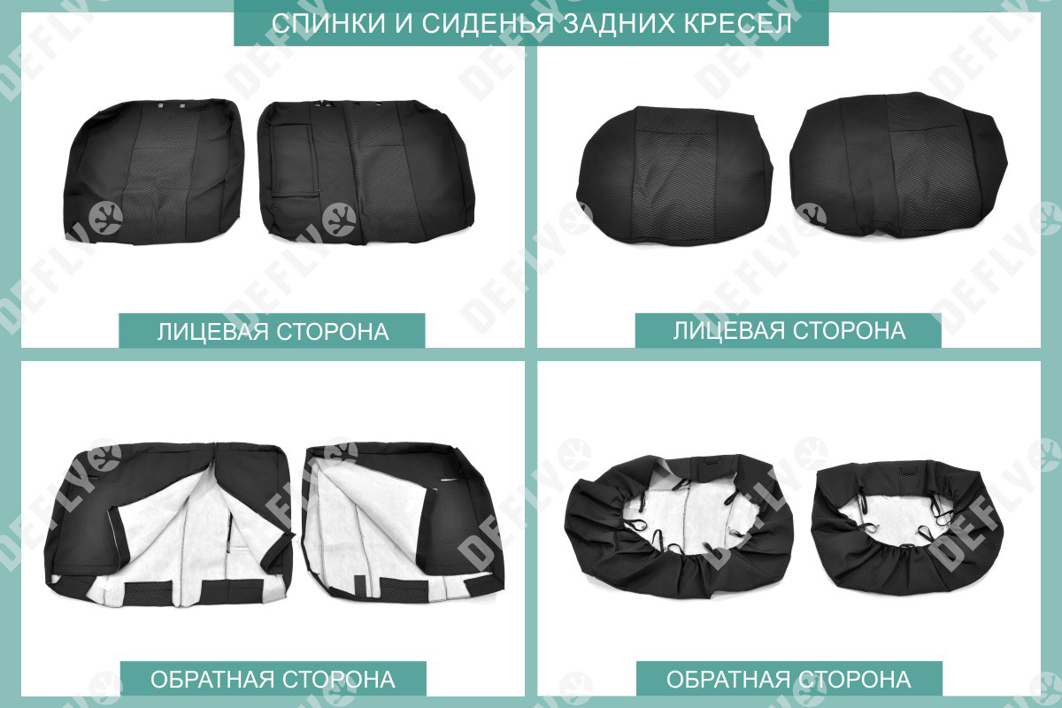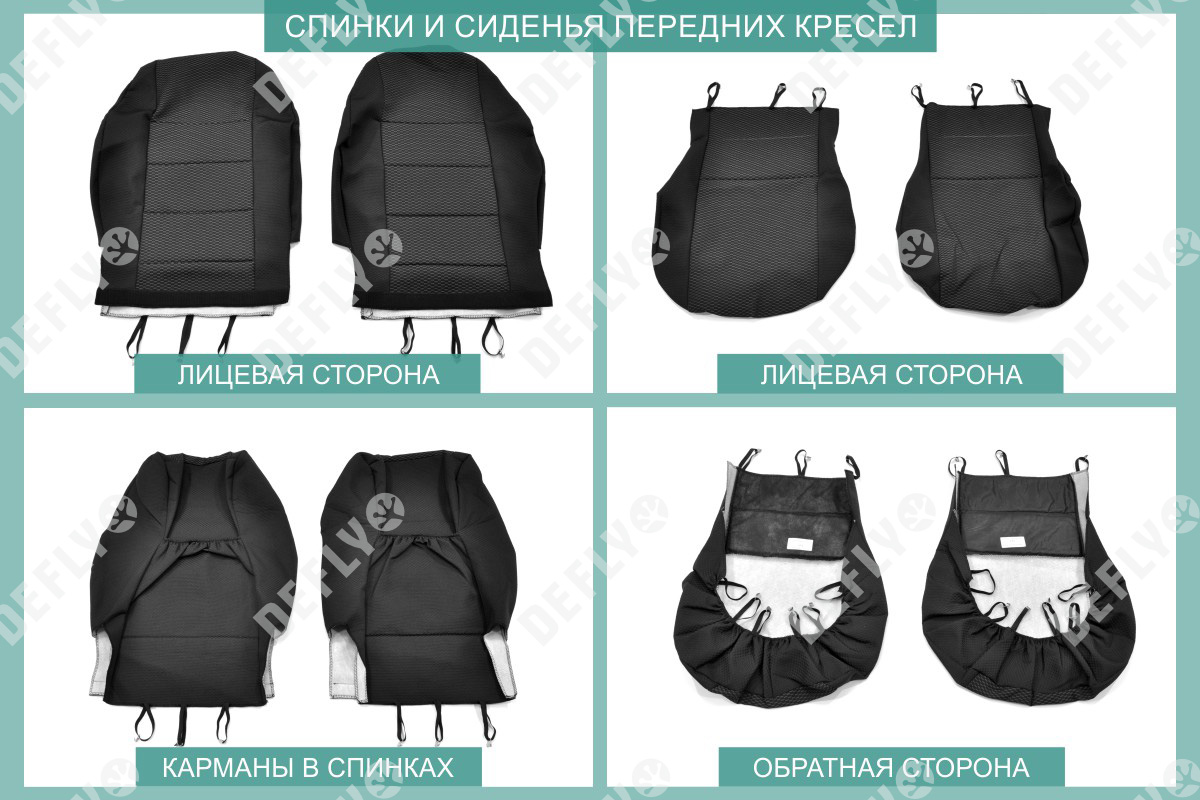 Материал: Жаккард, Цвет: Черный и темно-серый (оттенок и рисунок ткани может незначительно отличаться). Модельные чехлы от производителя “Defly” индивидуально сконструированы для каждого автомобиля. Изготовленные по лекалам оригинальных кресел, чехлы гарантируют идеальную посадку. В комплектацию входят детали всех элементов салона: передних кресел, заднего дивана, третьего ряда сидений, подголовников, подлокотников и т.д. Спинки передних кресел дополнены карманами. Все швы и технологические отверстия обработаны на оверлоке. Чехлы не ограничивают заводскую функциональность салона. Наличие в чехлах специального распускаемого шва не препятствует своевременному и полному раскрытию подушек безопасности. Специально разработанная система креплений позволяет надежно зафиксировать изделия. Авточехлы изготовлены из двух видов жаккарда: черного и темно-серого с рисунком. Подголовники, боковые и задние элементы выполнены из черного жаккарда. Центральные вставки сидений изготовлены из темно-серого жаккарда. Жаккард обеспечивает циркуляцию воздуха, что обеспечивает комфорт при длительных поездках. * Представленные фотографии являются примером исполнения и служат для демонстрации материалов и конструкции чехлов