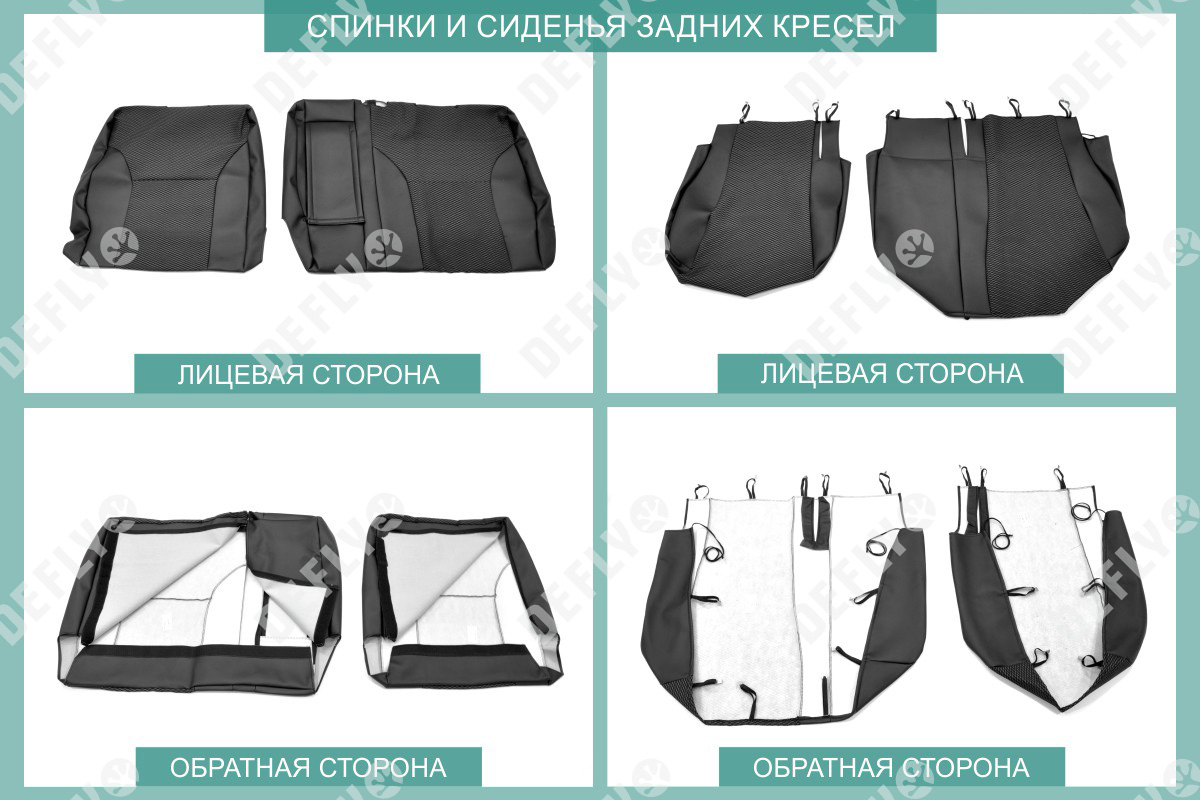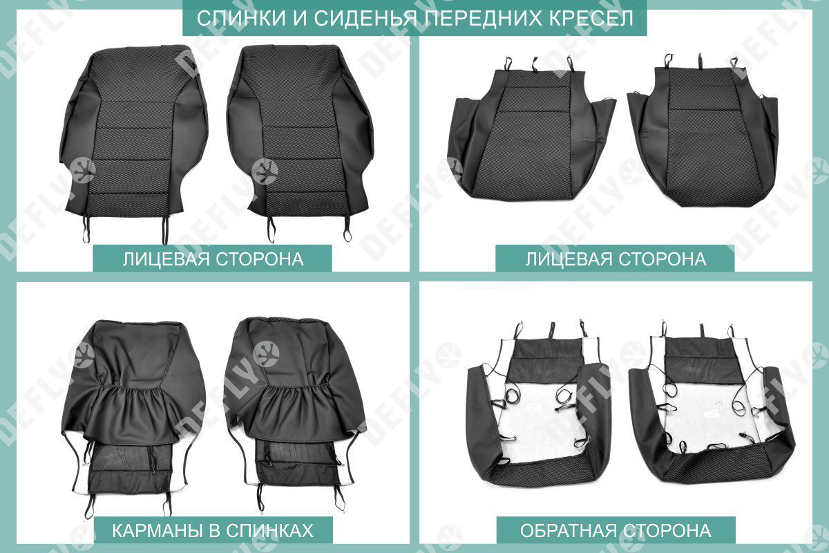 Материал: Экокожа гладкая, жаккард, Цвет: Черный и темно-серый (оттенок ткани может незначительно отличаться). Модельные чехлы от производителя “Defly” индивидуально сконструированы для каждого автомобиля. Изготовленные по лекалам оригинальных кресел, чехлы гарантируют идеальную посадку. В комплектацию входят детали всех элементов салона: передних кресел, заднего дивана, третьего ряда сидений, подголовников, подлокотников и т.д. Спинки передних кресел дополнены карманами. Все швы и технологические отверстия обработаны на оверлоке. Чехлы не ограничивают заводскую функциональность салона. Наличие в чехлах специального распускаемого шва не препятствует своевременному и полному раскрытию подушек безопасности. Специально разработанная система креплений позволяет надежно зафиксировать изделия. В комбинированных чехлах этой серии подголовники, боковые и задние элементы выполнены из черной экокожи, а центральные вставки сидений изготовлены из темно-серого жаккарда. Жаккардовые вставки обеспечивают циркуляцию воздуха, что обеспечивает комфорт при длительных поездках. * Представленные фотографии являются примером исполнения и служат для демонстрации материалов и конструкции чехлов.
