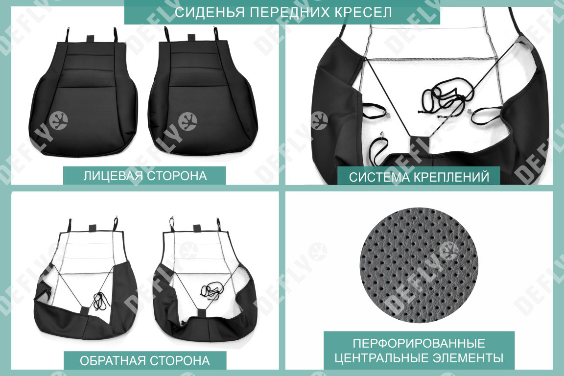 Материал: Экокожа гладкая, экокожа перфорированная, Цвет: Черный (оттенок ткани может незначительно отличаться). Модельные чехлы от производителя “Defly” индивидуально сконструированы для каждого автомобиля. Изготовленные по лекалам оригинальных кресел, чехлы гарантируют идеальную посадку. В комплектацию входят детали всех элементов салона: передних кресел, заднего дивана, третьего ряда сидений, подголовников, подлокотников и т.д. Спинки передних кресел дополнены карманами. Все швы и технологические отверстия обработаны на оверлоке. Чехлы не ограничивают заводскую функциональность салона. Наличие в чехлах специального распускаемого шва не препятствует своевременному и полному раскрытию подушек безопасности. Специально разработанная система креплений позволяет надежно зафиксировать изделия. Авточехлы изготовлены из двух видов экокожи черного цвета: гладкой и перфорированной. Перфорированная экокожа используется в центральных элементах, что обеспечивает циркуляцию воздуха. * Представленные фотографии являются примером исполнения и служат для демонстрации материалов и конструкции чехлов.