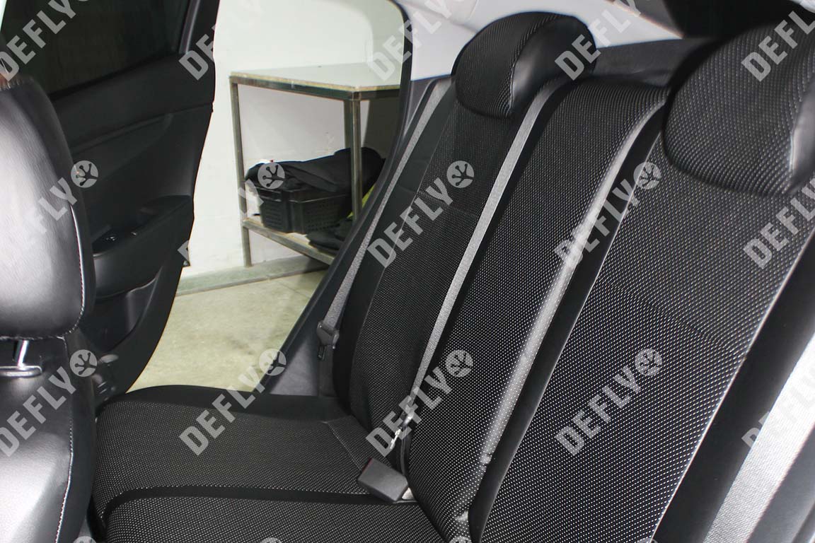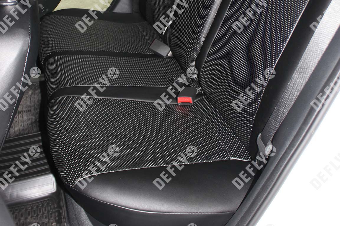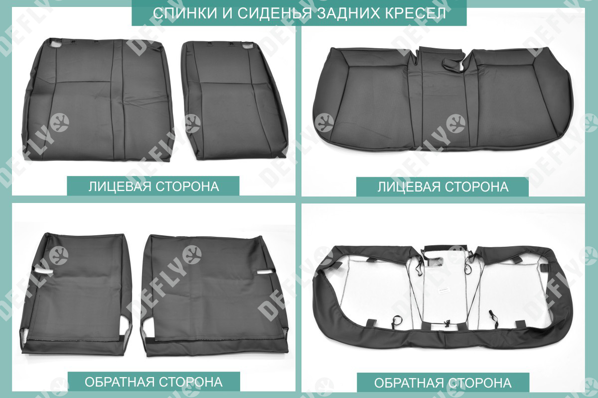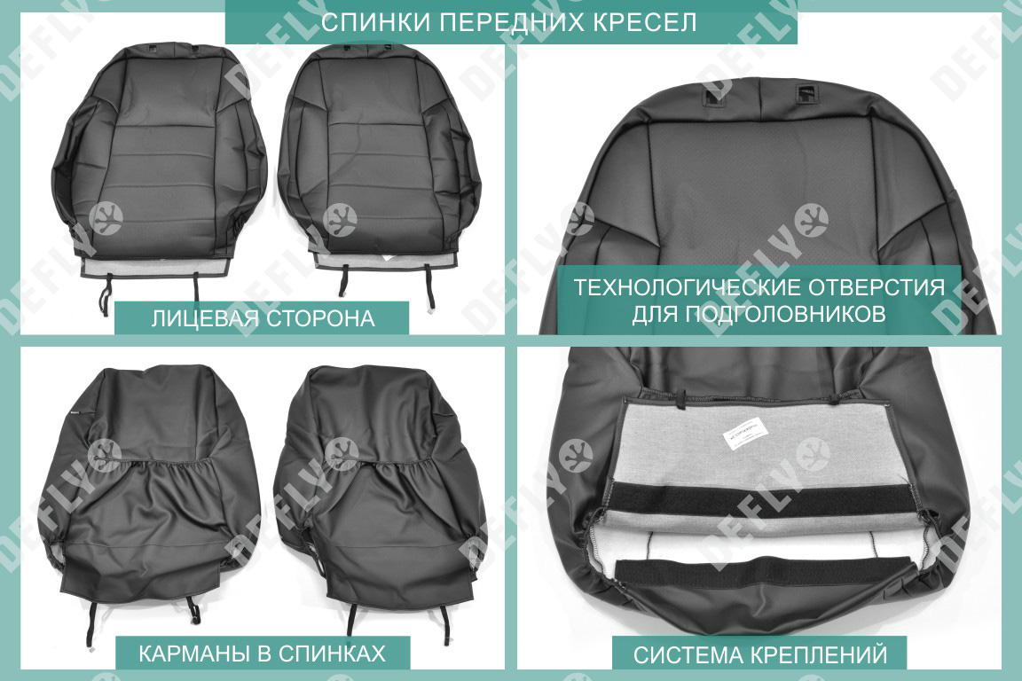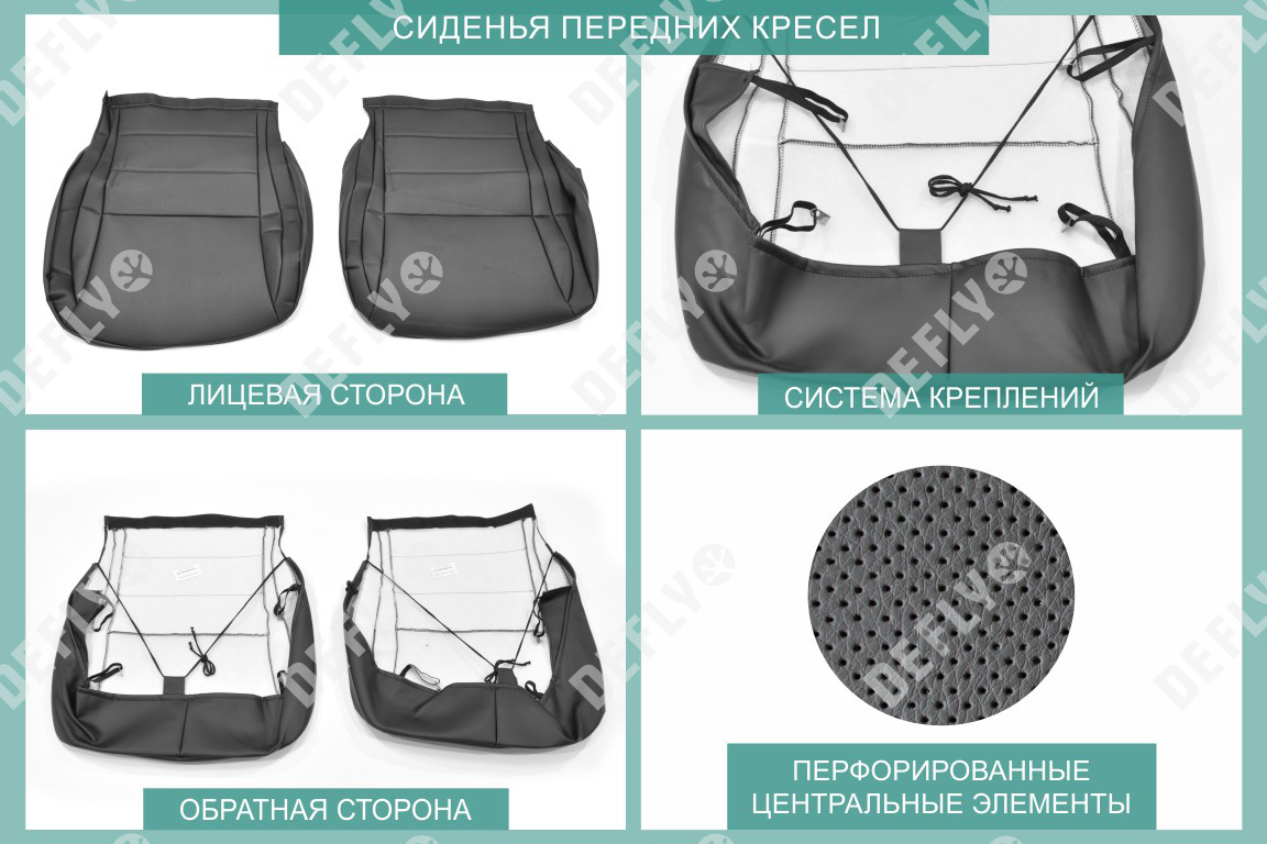 Материал: Экокожа гладкая, экокожа перфорированная, Цвет: Черный (оттенок ткани может незначительно отличаться). Модельные чехлы от производителя “Defly” индивидуально сконструированы для каждого автомобиля. Изготовленные по лекалам оригинальных кресел, чехлы гарантируют идеальную посадку. В комплектацию входят детали всех элементов салона: передних кресел, заднего дивана, третьего ряда сидений, подголовников, подлокотников и т.д. Спинки передних кресел дополнены карманами. Все швы и технологические отверстия обработаны на оверлоке. Чехлы не ограничивают заводскую функциональность салона. Наличие в чехлах специального распускаемого шва не препятствует своевременному и полному раскрытию подушек безопасности. Специально разработанная система креплений позволяет надежно зафиксировать изделия. Авточехлы изготовлены из двух видов экокожи черного цвета: гладкой и перфорированной. Перфорированная экокожа используется в центральных элементах, что обеспечивает циркуляцию воздуха. * Представленные фотографии являются примером исполнения и служат для демонстрации материалов и конструкции чехлов.