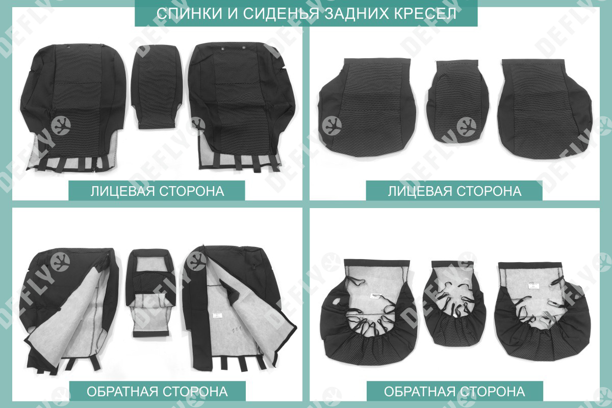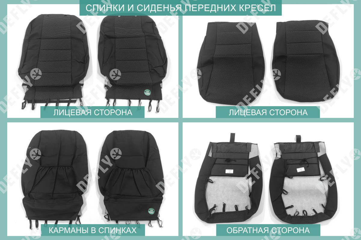 Материал: Жаккард, Цвет: Черный и темно-серый (оттенок и рисунок ткани может незначительно отличаться). Модельные чехлы от производителя “Defly” индивидуально сконструированы для каждого автомобиля. Изготовленные по лекалам оригинальных кресел, чехлы гарантируют идеальную посадку. В комплектацию входят детали всех элементов салона: передних кресел, заднего дивана, третьего ряда сидений, подголовников, подлокотников и т.д. Спинки передних кресел дополнены карманами. Все швы и технологические отверстия обработаны на оверлоке. Чехлы не ограничивают заводскую функциональность салона. Наличие в чехлах специального распускаемого шва не препятствует своевременному и полному раскрытию подушек безопасности. Специально разработанная система креплений позволяет надежно зафиксировать изделия. Авточехлы изготовлены из двух видов жаккарда: черного и темно-серого с рисунком. Подголовники, боковые и задние элементы выполнены из черного жаккарда. Центральные вставки сидений изготовлены из темно-серого жаккарда. Жаккард обеспечивает циркуляцию воздуха, что обеспечивает комфорт при длительных поездках. * Представленные фотографии являются примером исполнения и служат для демонстрации материалов и конструкции чехлов