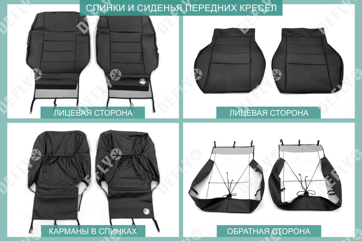 Материал: Экокожа гладкая, экокожа перфорированная, Цвет: Черный (оттенок ткани может незначительно отличаться). Модельные чехлы от производителя “Defly” индивидуально сконструированы для каждого автомобиля. Изготовленные по лекалам оригинальных кресел, чехлы гарантируют идеальную посадку. В комплектацию входят детали всех элементов салона: передних кресел, заднего дивана, третьего ряда сидений, подголовников, подлокотников и т.д. Спинки передних кресел дополнены карманами. Все швы и технологические отверстия обработаны на оверлоке. Чехлы не ограничивают заводскую функциональность салона. Наличие в чехлах специального распускаемого шва не препятствует своевременному и полному раскрытию подушек безопасности. Специально разработанная система креплений позволяет надежно зафиксировать изделия. Авточехлы изготовлены из двух видов экокожи черного цвета: гладкой и перфорированной. Перфорированная экокожа используется в центральных элементах, что обеспечивает циркуляцию воздуха. * Представленные фотографии являются примером исполнения и служат для демонстрации материалов и конструкции чехлов.