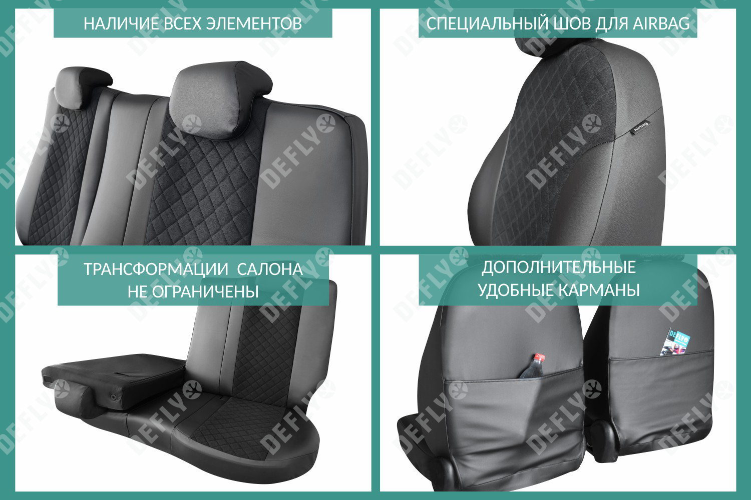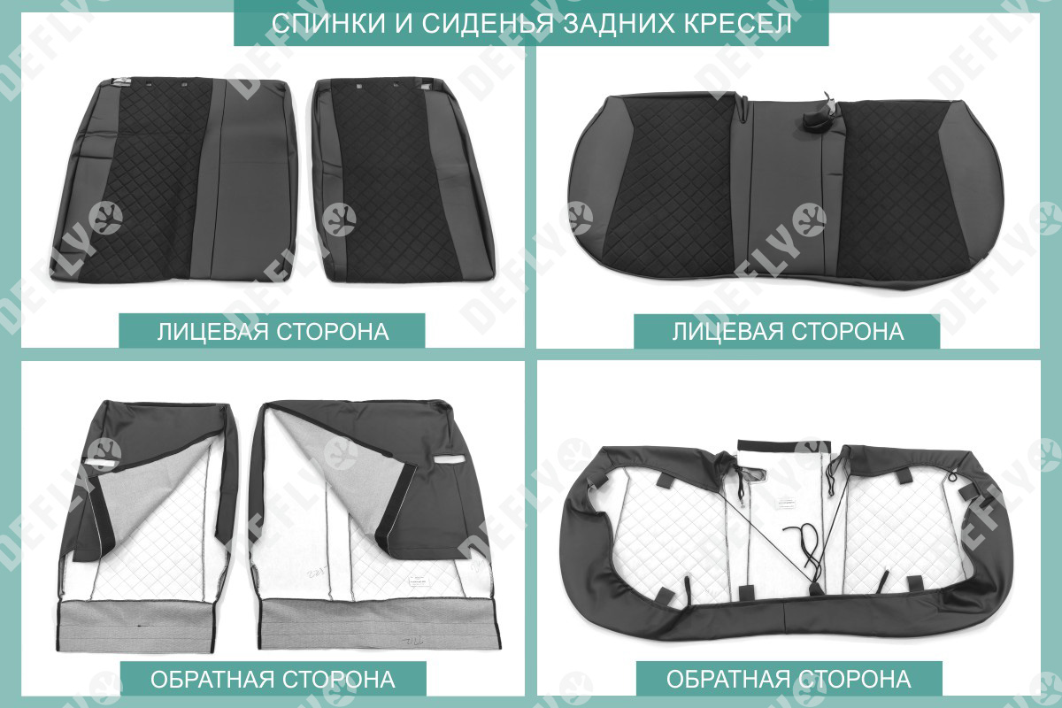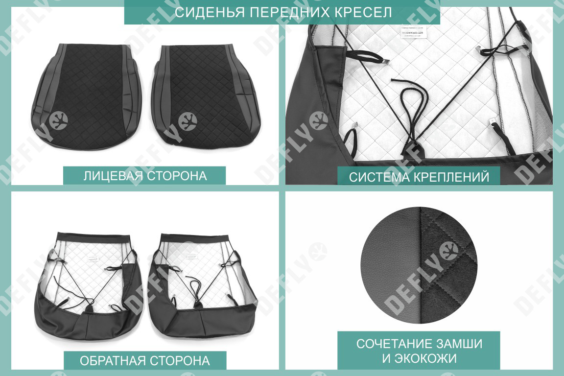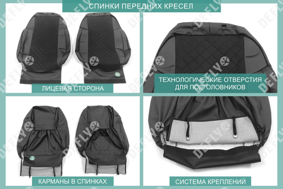 Материал: Экокожа гладкая, замша, Узор на вставках: прострочка «Ромб», Цвет: Черный (оттенок ткани может незначительно отличаться). Модельные чехлы от производителя “Defly” индивидуально сконструированы для каждого автомобиля. Изготовленные по лекалам оригинальных кресел, чехлы гарантируют идеальную посадку. В комплектацию входят детали всех элементов салона: передних кресел, заднего дивана, третьего ряда сидений, подголовников, подлокотников и т.д. Спинки передних кресел дополнены карманами. Все швы и технологические отверстия обработаны на оверлоке. Чехлы не ограничивают заводскую функциональность салона. Наличие в чехлах специального распускаемого шва не препятствует своевременному и полному раскрытию подушек безопасности. Специально разработанная система креплений позволяет надежно зафиксировать изделия. В комбинированных чехлах этой серии подголовники, боковые и задние элементы выполнены из черной экокожи, а центральные вставки сидений изготовлены из замши с прострочкой “Ромб”. Гарантируют комфортную посадку и приятные тактильные ощущения. * Представленные фотографии являются примером исполнения и служат для демонстрации материалов и конструкции чехлов.
