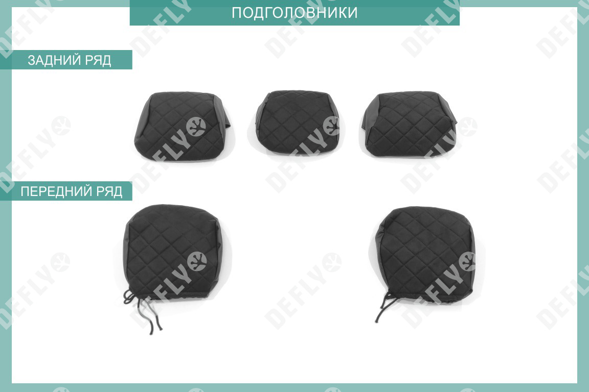 Спинка переднего кресла левого - 1 шт. Спинка переднего кресла правого - 1 шт. Сиденье переднего кресла - 1 шт. Подголовник переднего кресла - 2 шт. Спинка заднего дивана малая - 1 шт. Спинка заднего дивана большая - 1 шт. Сиденье заднего дивана - 1 шт. Подголовник 2-го ряда - 2 шт. Подголовник 2-го ряда центральный - 1 шт. Всего изделий: 12шт