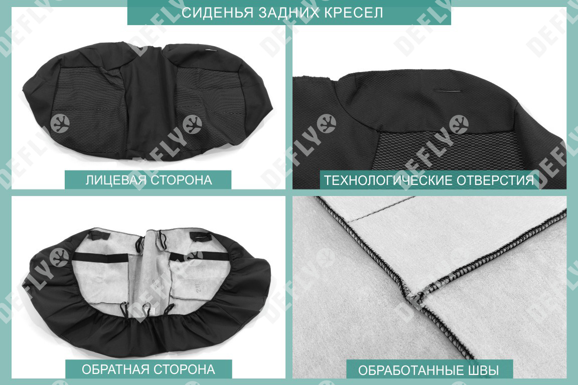 Материал: Жаккард, Цвет: Черный и темно-серый (оттенок и рисунок ткани может незначительно отличаться). Модельные чехлы от производителя “Defly” индивидуально сконструированы для каждого автомобиля. Изготовленные по лекалам оригинальных кресел, чехлы гарантируют идеальную посадку. В комплектацию входят детали всех элементов салона: передних кресел, заднего дивана, третьего ряда сидений, подголовников, подлокотников и т.д. Спинки передних кресел дополнены карманами. Все швы и технологические отверстия обработаны на оверлоке. Чехлы не ограничивают заводскую функциональность салона. Наличие в чехлах специального распускаемого шва не препятствует своевременному и полному раскрытию подушек безопасности. Специально разработанная система креплений позволяет надежно зафиксировать изделия. Авточехлы изготовлены из двух видов жаккарда: черного и темно-серого с рисунком. Подголовники, боковые и задние элементы выполнены из черного жаккарда. Центральные вставки сидений изготовлены из темно-серого жаккарда. Жаккард обеспечивает циркуляцию воздуха, что обеспечивает комфорт при длительных поездках. * Представленные фотографии являются примером исполнения и служат для демонстрации материалов и конструкции чехлов