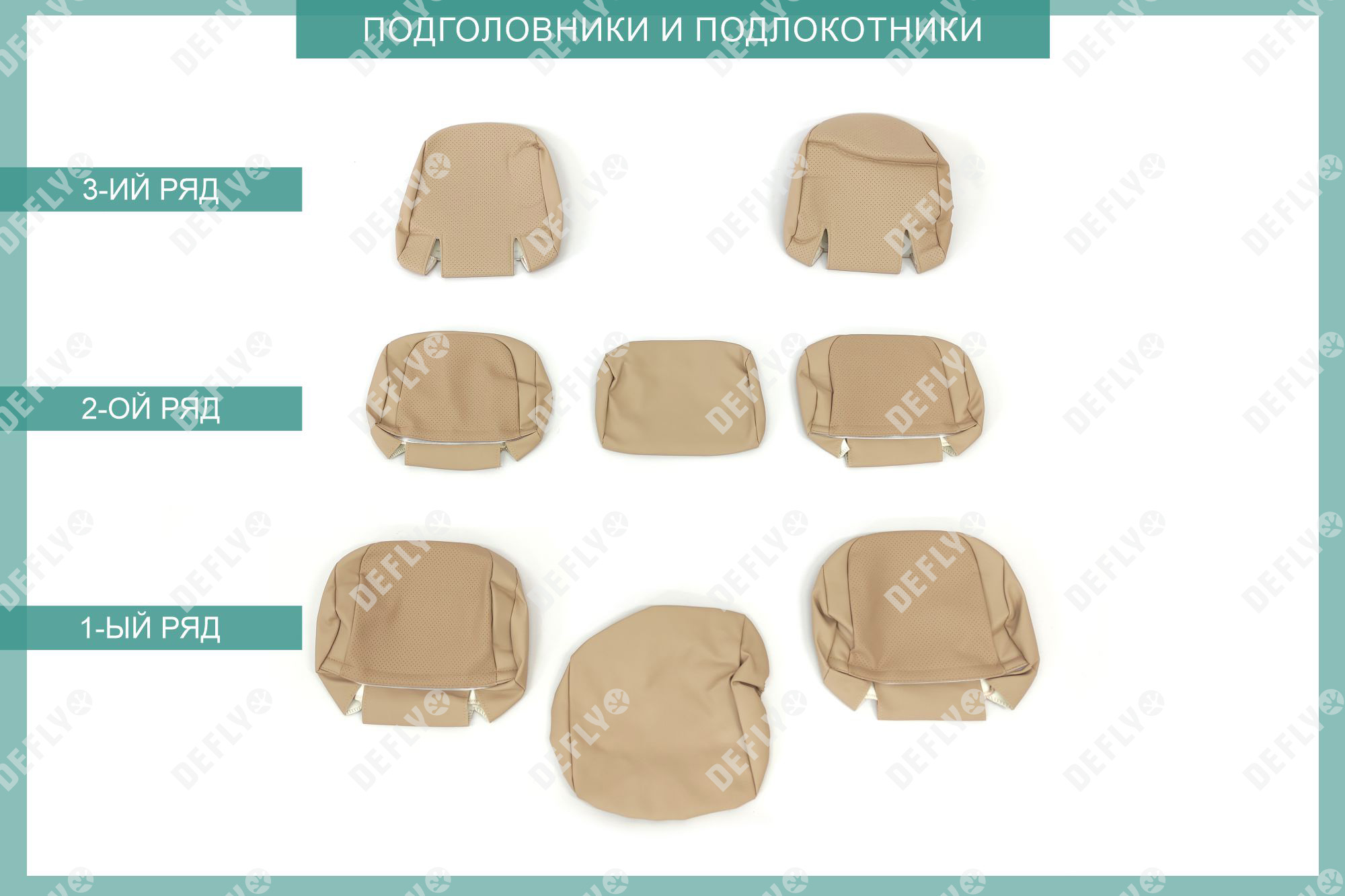 Первый ряд: Подголовник переднего кресла - 2шт Спинка переднего кресла – 2 шт Сиденье переднего кресла - 2шт Подлокотник переднего кресла центральный – 1 шт Второй ряд: Подголовник заднего ряда - 2шт Подголовник заднего ряда центральный - 1шт Спинка дивана среднего ряда – 2 шт Спинка дивана среднего ряда центральная – 1 шт Сиденье среднего дивана большое - 1шт Сиденье среднего дивана малое - 1шт Третий ряд: Подголовник заднего ряда - 2шт Спинка дивана заднего ряда - 2шт Сиденье дивана заднего ряда - 2шт Всего: 21 изделие