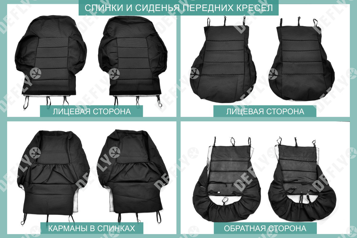 Материал: Жаккард, Цвет: Черный и темно-серый (оттенок и рисунок ткани может незначительно отличаться). Модельные чехлы от производителя “Defly” индивидуально сконструированы для каждого автомобиля. Изготовленные по лекалам оригинальных кресел, чехлы гарантируют идеальную посадку. В комплектацию входят детали всех элементов салона: передних кресел, заднего дивана, третьего ряда сидений, подголовников, подлокотников и т.д. Спинки передних кресел дополнены карманами. Все швы и технологические отверстия обработаны на оверлоке. Чехлы не ограничивают заводскую функциональность салона. Наличие в чехлах специального распускаемого шва не препятствует своевременному и полному раскрытию подушек безопасности. Специально разработанная система креплений позволяет надежно зафиксировать изделия. Авточехлы изготовлены из двух видов жаккарда: черного и темно-серого с рисунком. Подголовники, боковые и задние элементы выполнены из черного жаккарда. Центральные вставки сидений изготовлены из темно-серого жаккарда. Жаккард обеспечивает циркуляцию воздуха, что обеспечивает комфорт при длительных поездках. * Представленные фотографии являются примером исполнения и служат для демонстрации материалов и конструкции чехлов